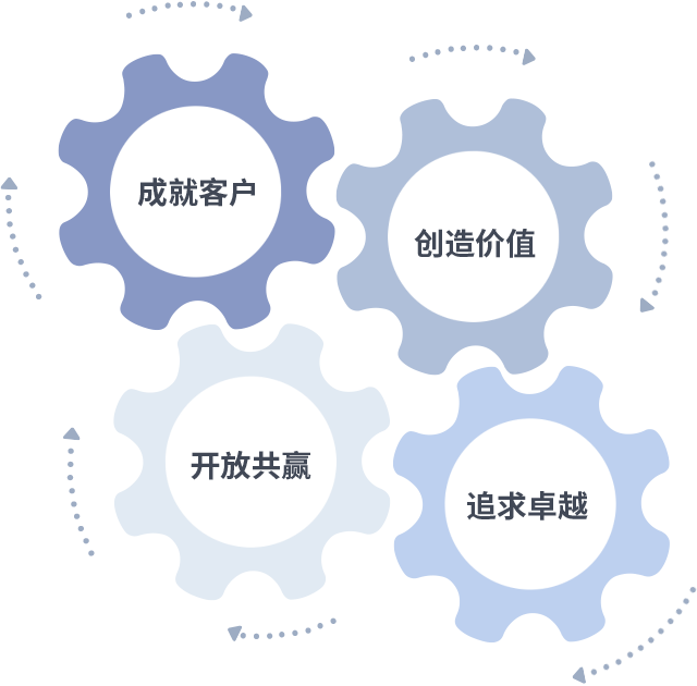 成就客户是一切决策的出发点,创造价值是衡量所有工作的标准,追求卓越是AG8亚游做事做人的态度,开放共赢是AG8亚游的格局也是最终的结果。价值观的齿轮环环相扣,推动着组织里的每个人不断向前。